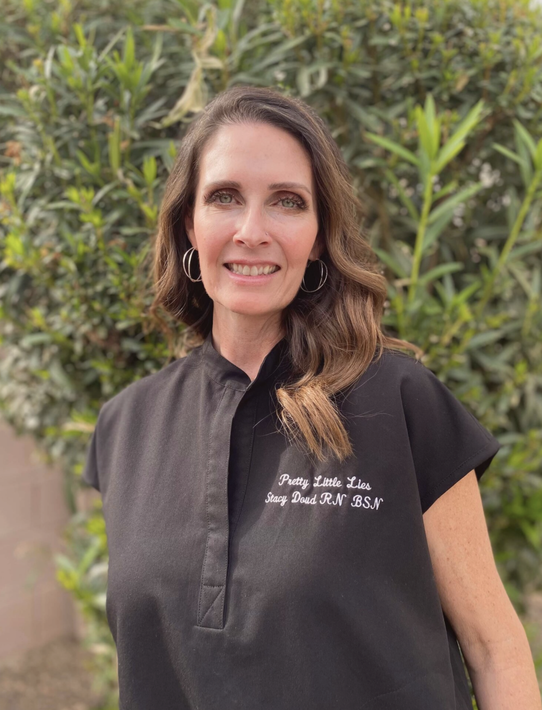 Stacy Doud, owner and Aesthetic Injector at Pretty Little Lies Aesthetics. Stacy obtained her nursing degree from Mesa Community College in 2013, and competed her BSN degree at Grand Canyon University in 2015. She began her nursing career at a local Arizona hospital gaining experience in Neurology, Telemetry and Critical Care (ICU). She spent the next 7 years providing end of life care as a Hospice nurse and Patient Care Manager. Stacy began training in aesthetic injections in 2018, working along side some of the best injectors in Arizona and California. She is passionate about continued education and providing her clients with the safest, most effective cosmetic treatments available. Stacy grew up in Southern California and relocated to Arizona in 2003. She enjoys spending time with her husband and two daughters. In her free time she enjoys camping in her RV, swimming and spending time with friends.